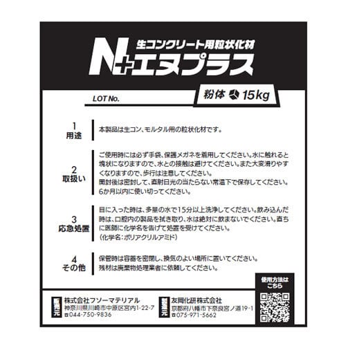 工事現場での残コン処理や、生コン工場での戻りコン処理の際にご利用しやすい粉体タイプのエヌプラス。大容量タイプの15kgです。